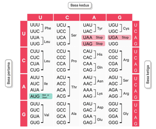 Apabila urutan suatu rantai DNA antisense adalah sebagai berikut, TAC-AGA-AAA-GTC-ATT maka urutan asam amino yang diperoleh adalah….